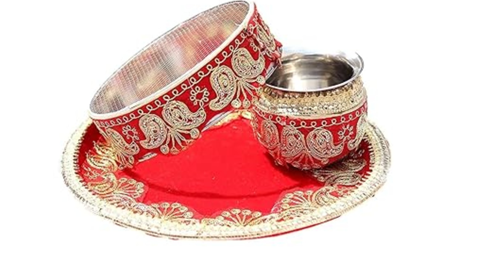 This Karva Chauth plate, which comes for Rs 1,750, is listed in ₹ 399 with 71% offer on Amazon. This plate prepared on red laces and heavy work is the best for those who do not like much shine. Steel plate will also be found with steel plate. Apart from Karvachauth, you can also use the plate on a festival like Diwali, Rakshabandhan. See more information here.