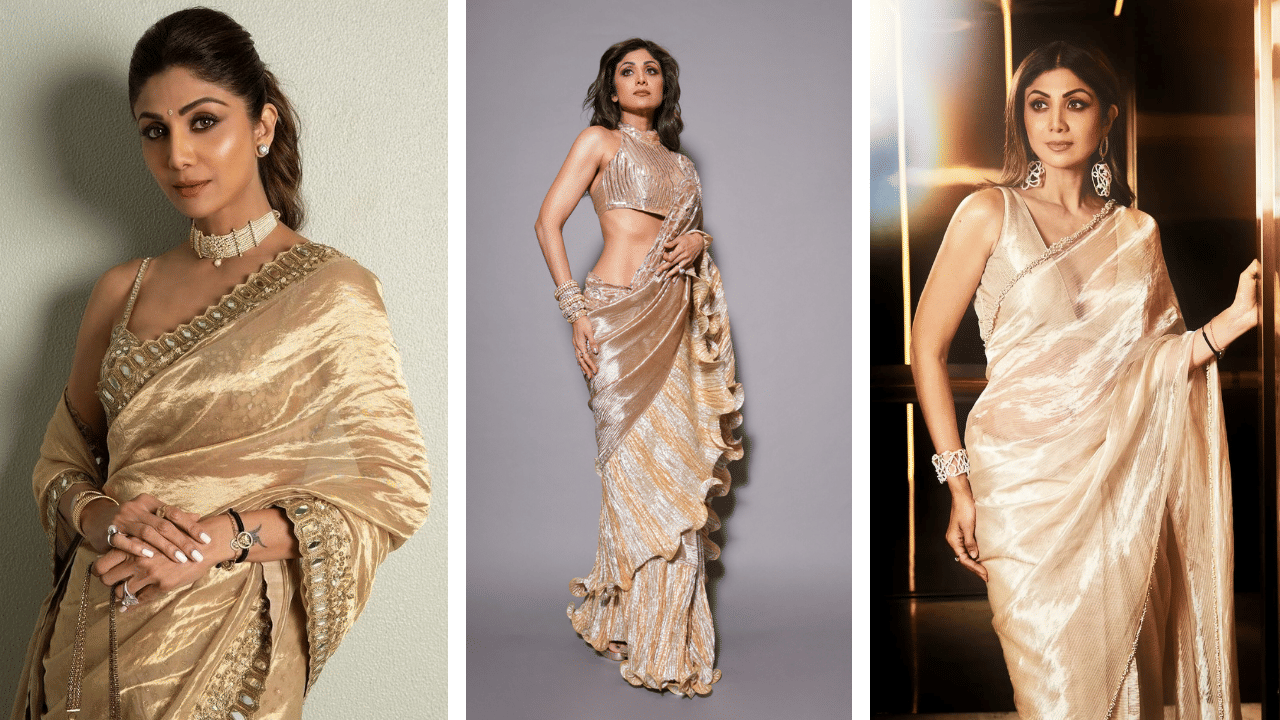 If you’re fasting for your beloved under the moonlight, why not mirror its glow? Golden and champagne tones bring an unmatched aura of divinity and elegance. Pair a golden saree or lehenga with kundan jewellery and soft nude makeup for that goddess-like radiance. Add a statement choker or heavy jhumkas to complete the royal vibe.