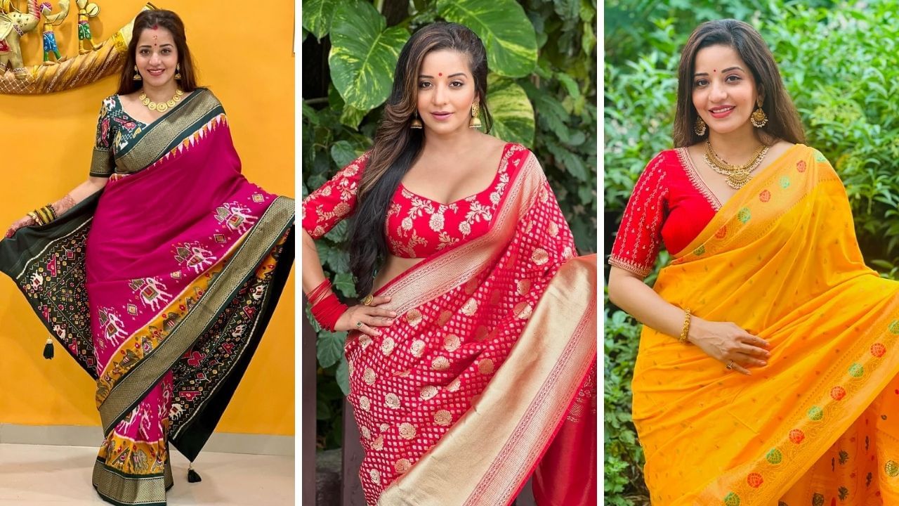 Pink color sada will also give a great look on Karva Chauth. Monalisa is wearing a saree designed with flower leaves, on whose border Banarasi Zari has been in turn. The actress has gathered her look with earrings, bangles ring and especially Mangalasutra. Monalisa looks gorgeous by putting sindoor in the lipstick of creamy texture and demand on the forehead.
