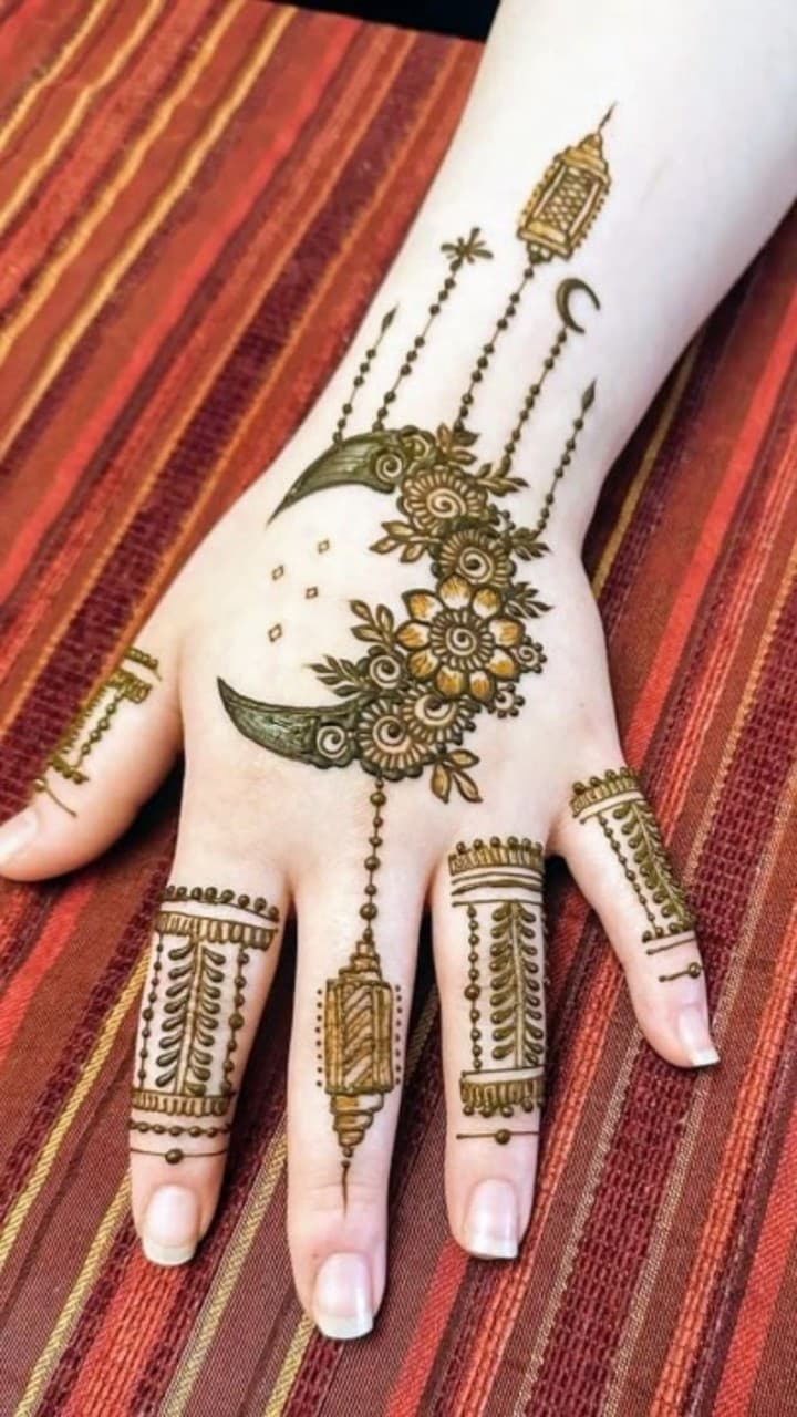 If you do not want to apply mehendi, then choose the minimalist mehendi design of Bollywood. Here, small flowers have been made on the palm making a moon, while a similar design has been given on the finger also.