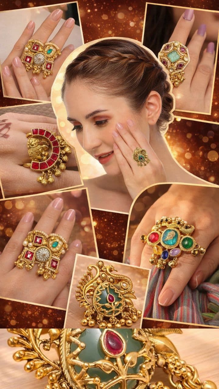 If you want a ring in a heavy statement piece, then today we have brought for you, this peacock design ring with heavy stones and ghungroo work, will give a stylish look to the hands.