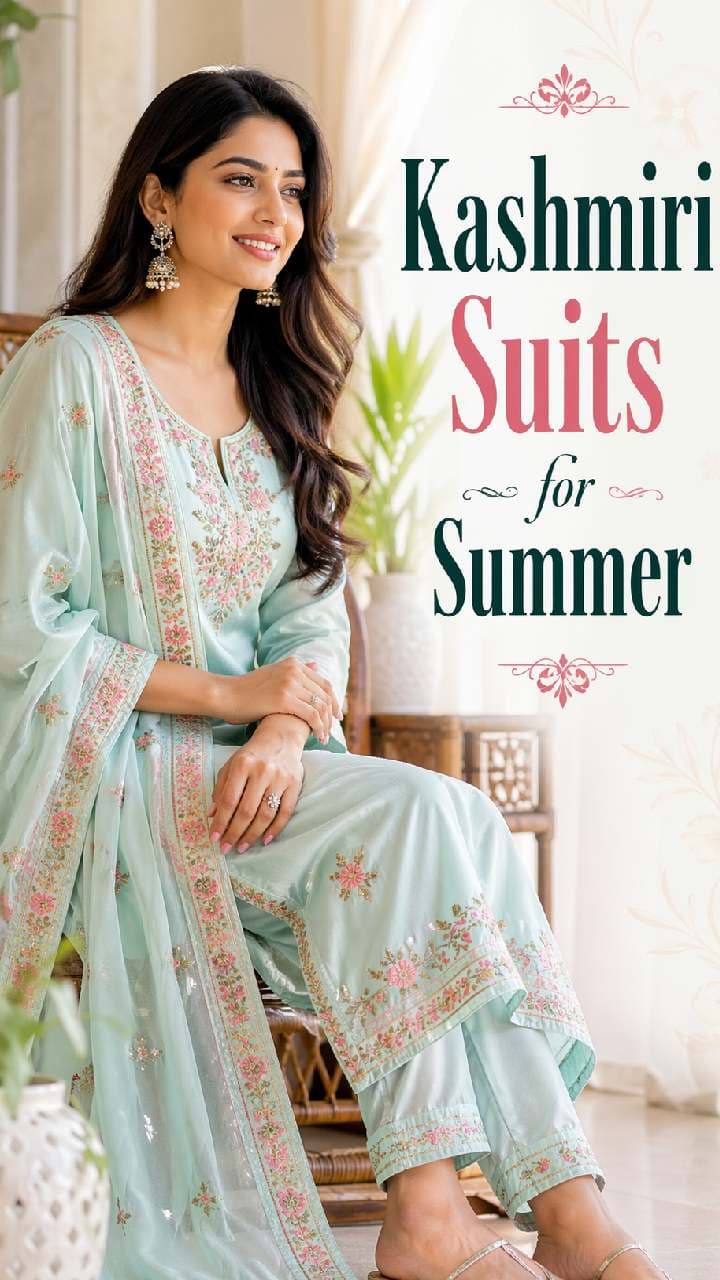 Light pastel shades like pink, mint green and sky blue give a cool feeling in summers. Cashmere suits in these colors give a very soft and classy look.
