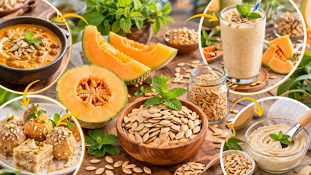 Kharbuja Beej Uses: Melon seeds are not useless, can be used in everything from gravy to sweets. Muskmelon Seed Reuse Ideas Kharbuja Beej Uses Gravy Smoothie Sweets Skin Benefits