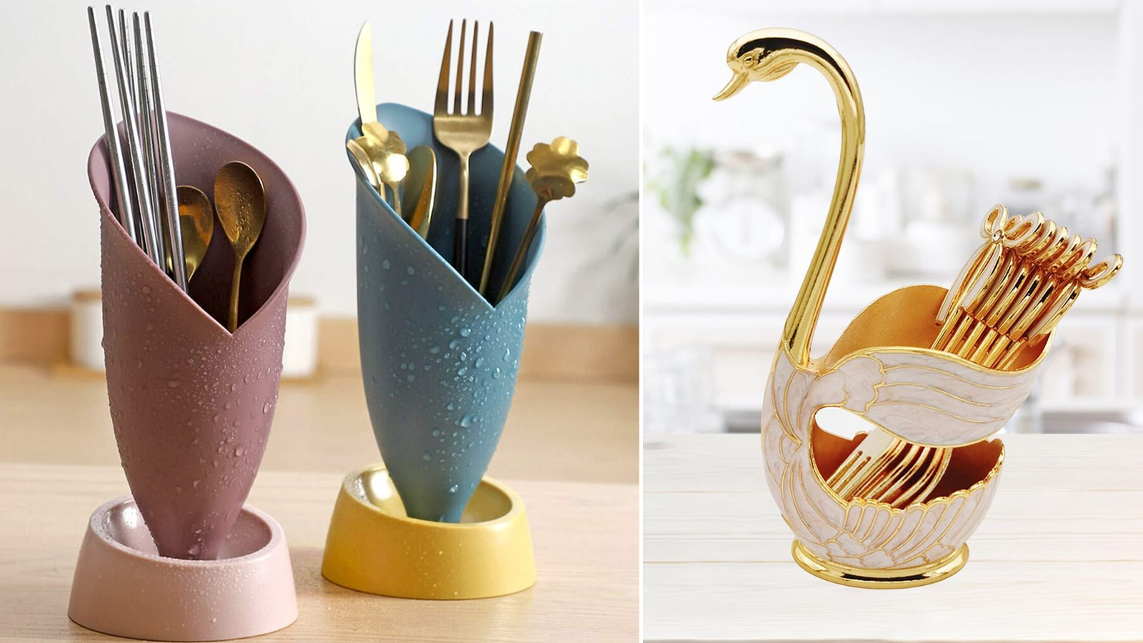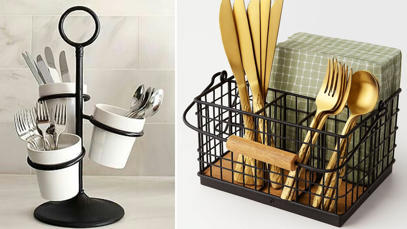 This is a very stylish and modern option. The metal mesh design allows air flow which helps the cutlery dry quickly. It looks very beautiful in black or silver finish.