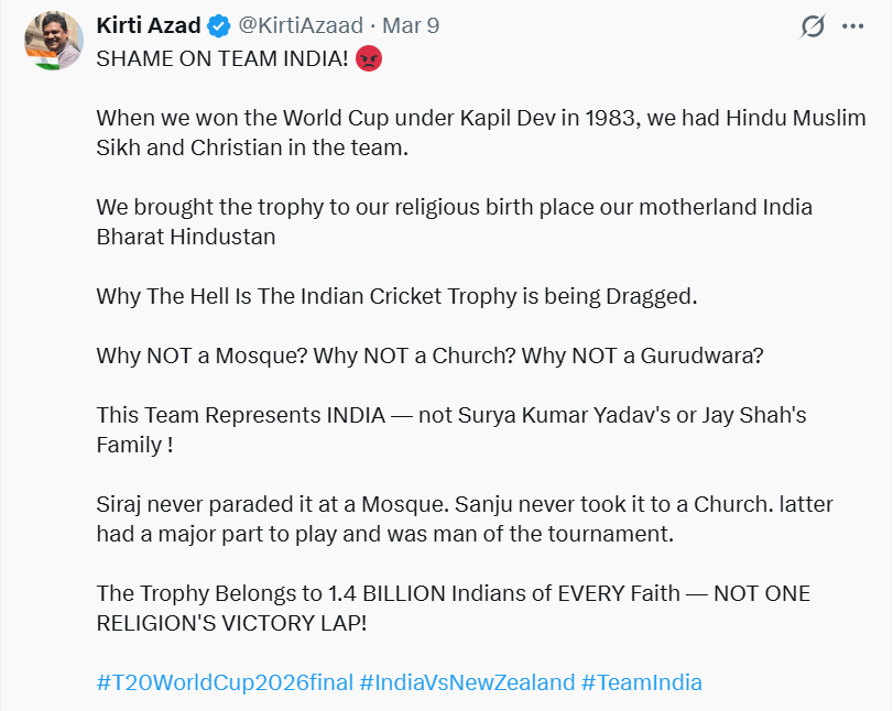 After India’s victory, Indian skipper Suryakumar Yadav, head coach Gautam Gambhir and ICC president Jay Shah visited a Hanuman temple in Ahmedabad with the trophy to offer prayers. Azad questioned the decision to take the trophy to a temple on social media, saying that the Indian team represents an entire nation, not a particular religion.