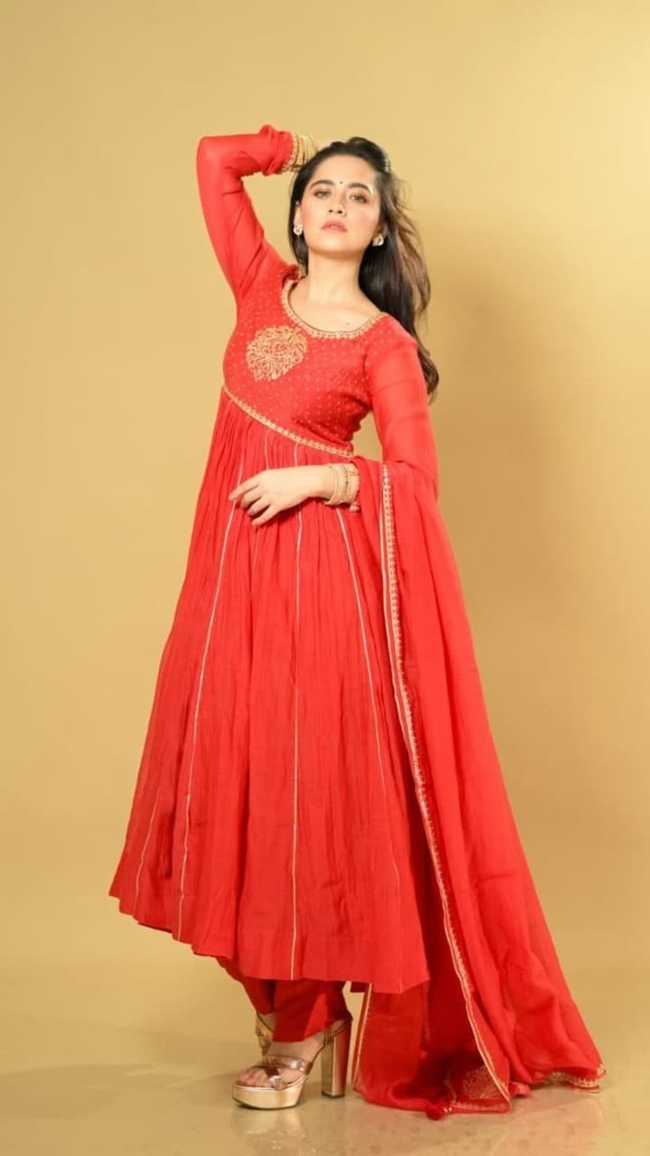 If you like vibrant colors then satin full length salwar suit with bud pattern will give you a royal and gorgeous look. It is available in the market for up to Rs 3K, you can give it a sexy look with a contrast dupatta.