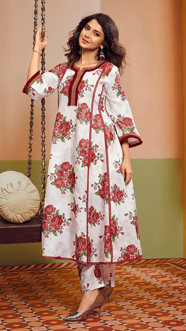 Choose this key hole flat neckline full length kurti with palazzo which is perfect for daily wear, office wear and summer wear. You can wear it with plain studs and heels. These are best for a comfortable look.