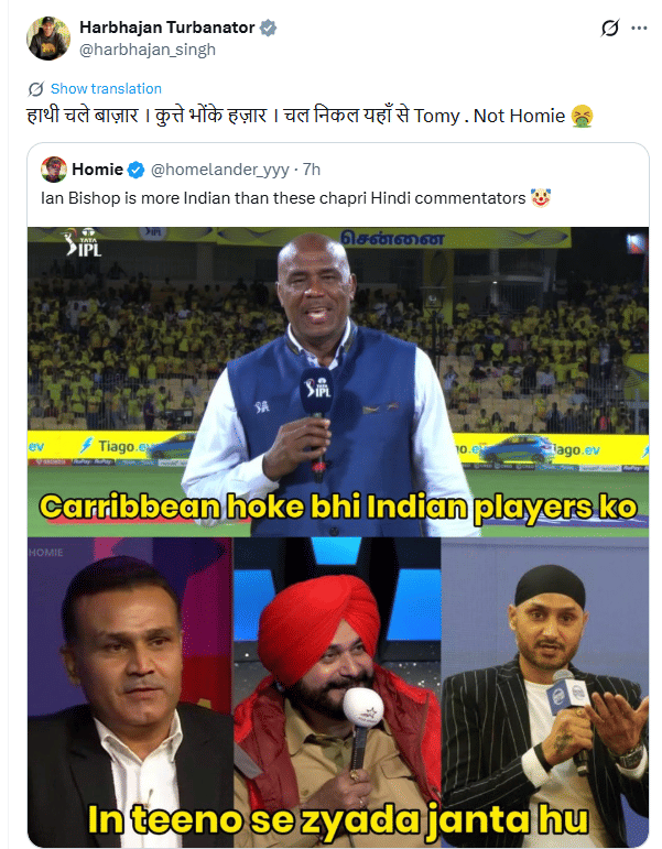 The user took a dig at the trio for their poor on-air analysis, while praising West Indies great Ian Bishop for his knowledge about young and rising Indian cricketers. The post didn’t go down well with Harbhajan, who decided to call out the user. Comparing him to a dog, Harbhajan posted a famous Hindi idiom.