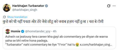 Hathi chale bazar, kutte bhaunke hazar. Chal nikal yaha se Tomy. Not homie (Thousands of dogs bark at the elephant when he walks past them),” Harbhajan wrote in Hindi, before asking the user to shut up and leave.