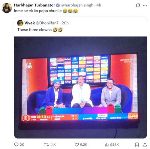 Harbhajan went on an abusive rant on X and was involved in a heated exchange with a few accounts, who criticised the standard of Hindi commentary during the IPL 2026 opener. It all started when a cricket meme account posted a picture of Harbhajan in the commentary box alongside Virender Sehwag and Navjot Singh Sidhu.