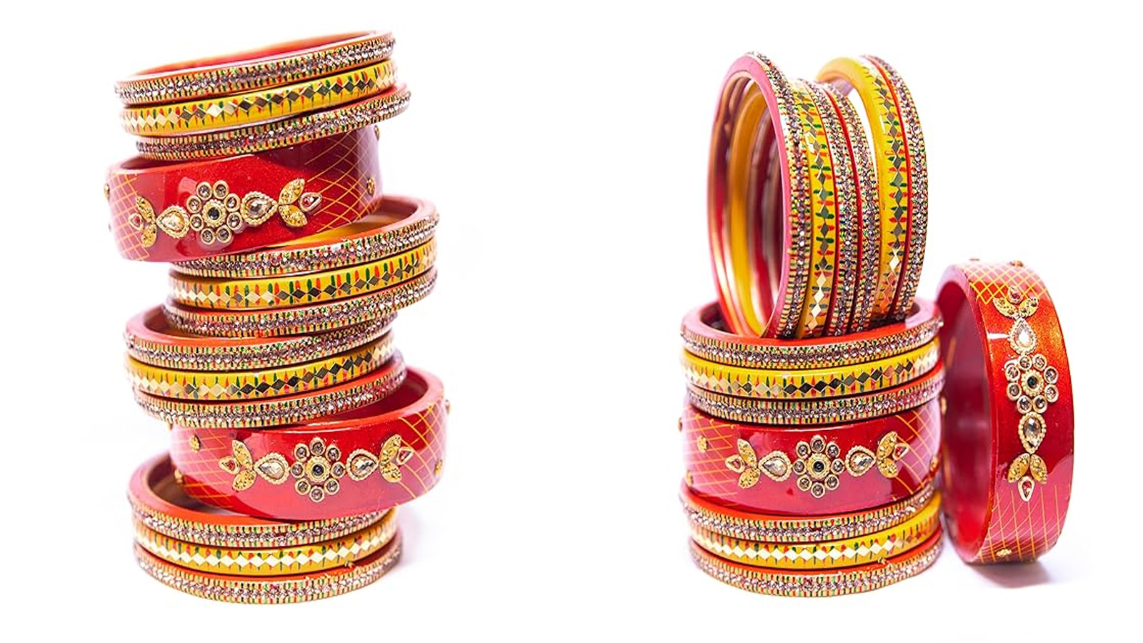 Lacquer bangles are made from resin (gum-like substance). This substance is obtained from lac insects found on the branches of trees. It is made soft and flexible by heating. When the lacquer melts and becomes soft, colors are added to it. Traditionally natural colors were used, but now artificial colors are also being used to make the bangles look more shiny. Hot lacquer is applied to a thin wooden or iron stick. Then it is cut in cylindrical form and given the shape of a bangle. This step is done entirely by hand. After cooling, the bangles are carved by hand. Then they are decorated with Gota, beads, stones, mirrors and golden borders. This is what makes them most attractive.