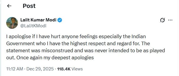 New Delhi: Former IPL chairman Lalit Modi on Monday issued a public apology over his recent social media remarks after a video featuring fugitive businessman Vijay Mallya sparked a political and public backlash.