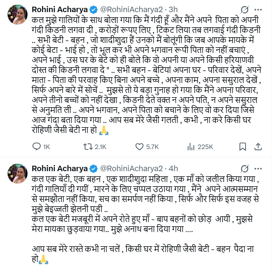 Rohini says she faced humiliation, abuse, and even threats. In emotional posts shared on X, Rohini Acharya described how she was spoken to, insulted, and threatened during a family confrontation. She said she was abused, humiliated, and even faced the threat of someone raising a slipper to hit her.