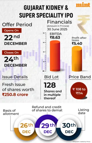 The allotment of the issue is expected to be finalised on Friday, December 26, 2025, while successful applicants are likely to receive their shares in their Demat accounts on Monday, December 29. Refunds for non-allottees will also be processed on the same day. Gujarat Kidney share is scheduled to debut on the BSE and NSE with a tentative listing date of December 30, 2025.