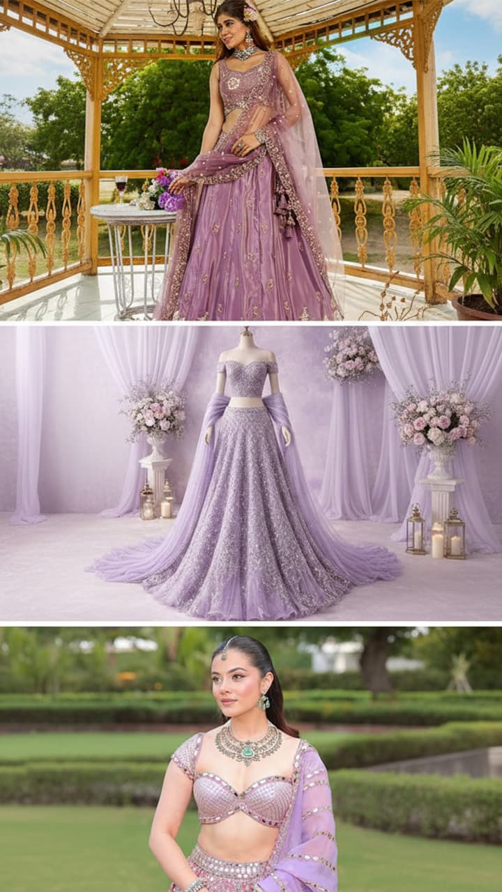 If you want to look like a princess in your wedding, then you can choose silver crystal work lavender lehenga. With which there is an off shoulder blouse and a net chunni has been draped in her hands.