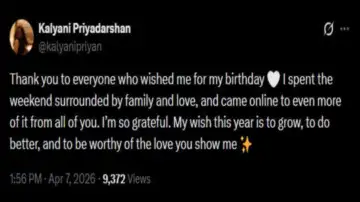 In an X post, Kalyani Priyadarshan expressed her feelings towards her well-wishers and said that she is blessed to be surrounded by her loved ones. The actress wrote, “Thank you to everyone who wished me for my birthday I spent the weekend surrounded by family and love, and came online to even more of it from all of you. I’m so grateful. My wish this year is to grow, to do better, and to be worthy of the love you show me.” (sic)