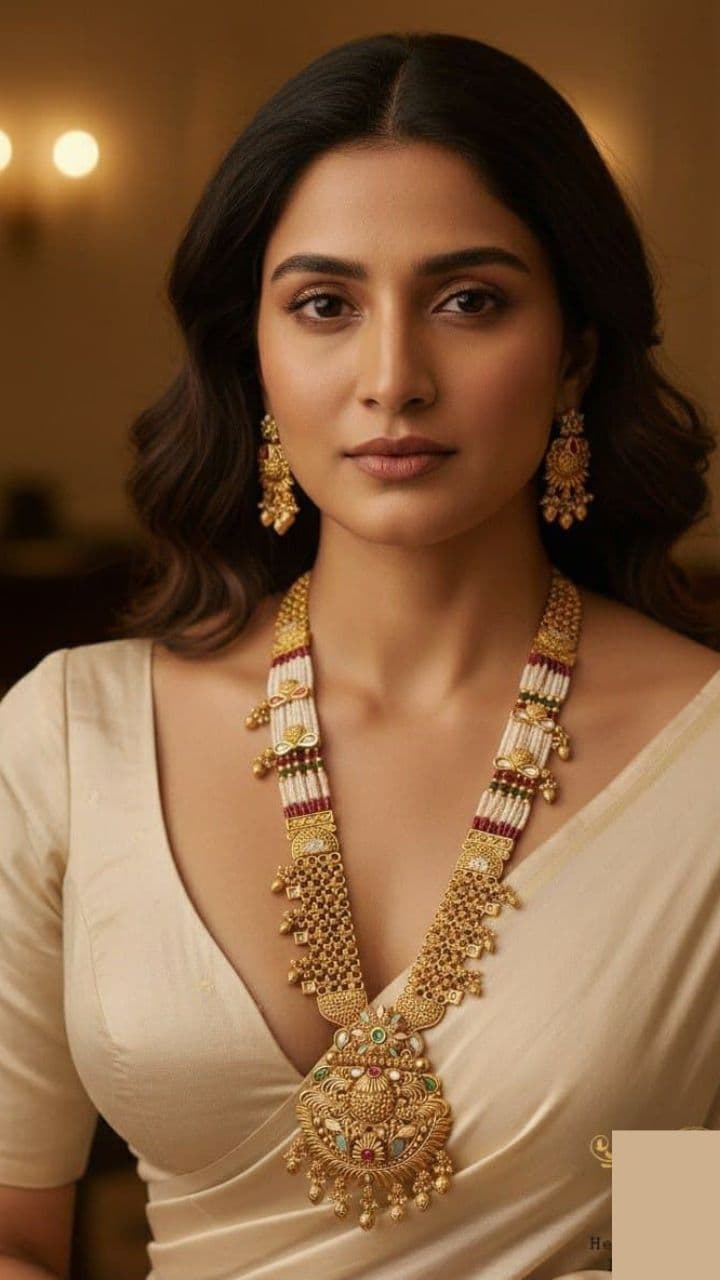 The blouse of South Indian saree has V neckline, so you can wear temple pattern or pearl and kundan necklace in Nita Ambani’s style, it will give you a traditional look.