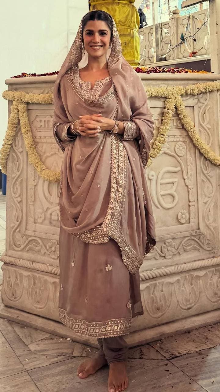 While going to Gurudwara or temple, you should dress up by wearing an embroidered scarf and suit. Both salwar or pants will look good with V neckline suit.