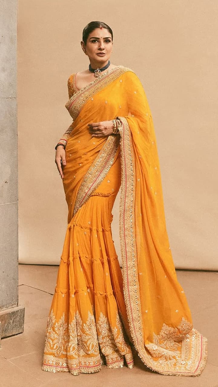 Raveena Tandon Saree Designs: If you want to get a graceful look on Ekadashi, then try a yellow saree like Raveena Tandon. They have many beautiful designs ranging from traditional to modern style, which you can buy now and keep in your closet.