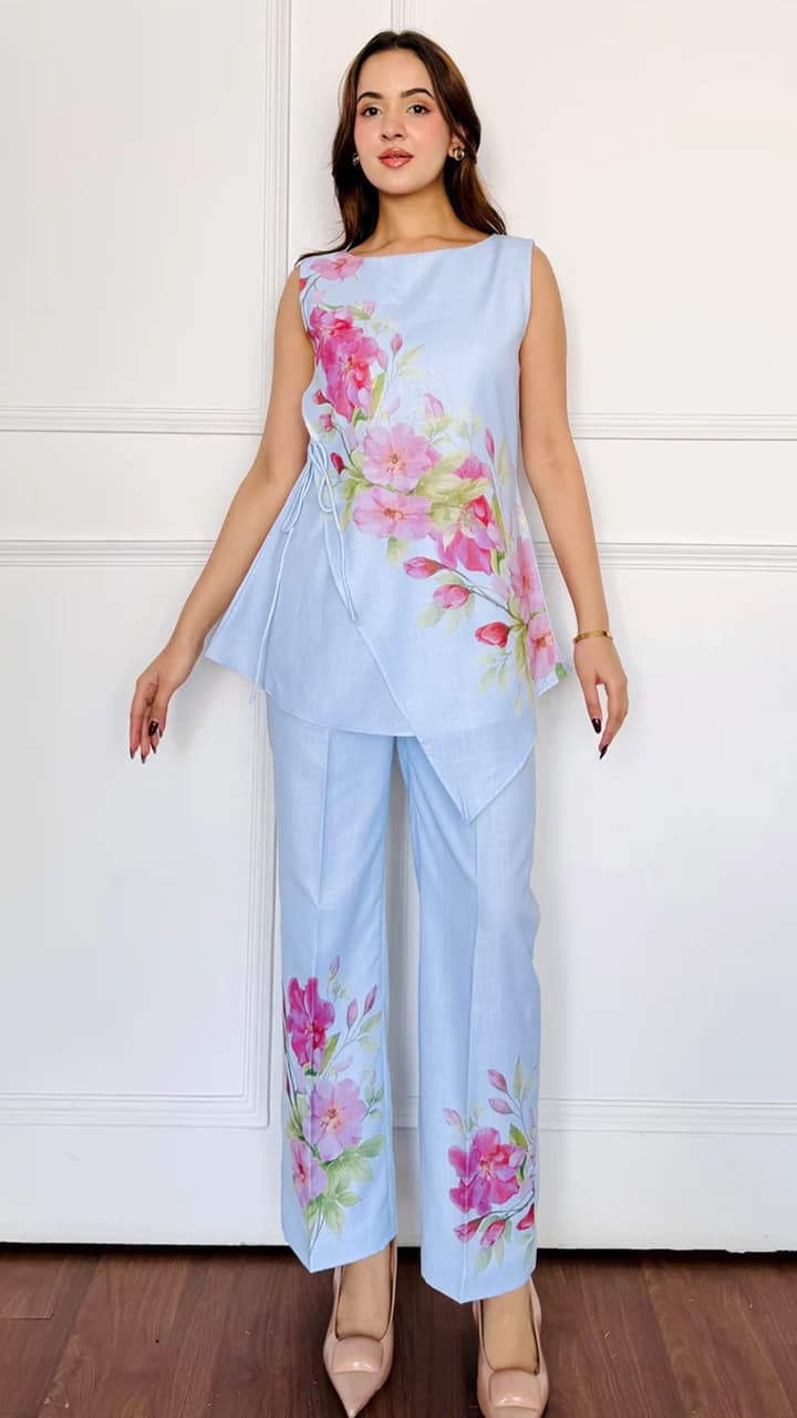 You can try a white color co-ord set for an office party. This set has flower and leaf print in blue color, which gives a fresh and elegant touch to your look.