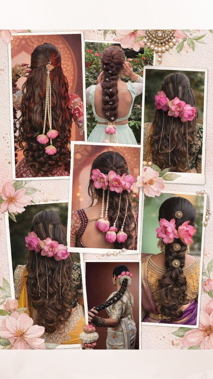 Another lotus hairstyle for open hair, part the hair in half from the front to the back and add beautiful hair accessories like lotus pendant braided in pearl.