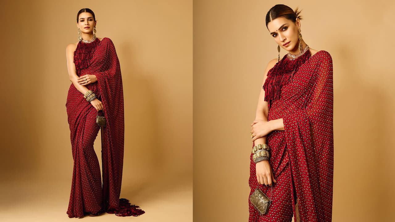 Kriti Sanon is wearing a very beautiful maroon booti print saree. Fringe has been cut on the pallu of the saree, which is giving a flowing look. You can get an aesthetic look by wearing this type of saree. You will get this type of saree of the actress within Rs 1500.