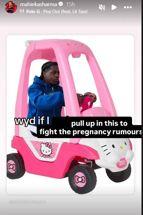 But she didn’t stop there. In another story, Mahieka joked that the internet might next assume she is pregnant. She shared a photo of a man driving a toy car and captioned it, “Wyd if I pull up in this to fight the pregnancy rumours.” Her lighthearted posts were widely shared and appreciated for their candid, humorous tone.