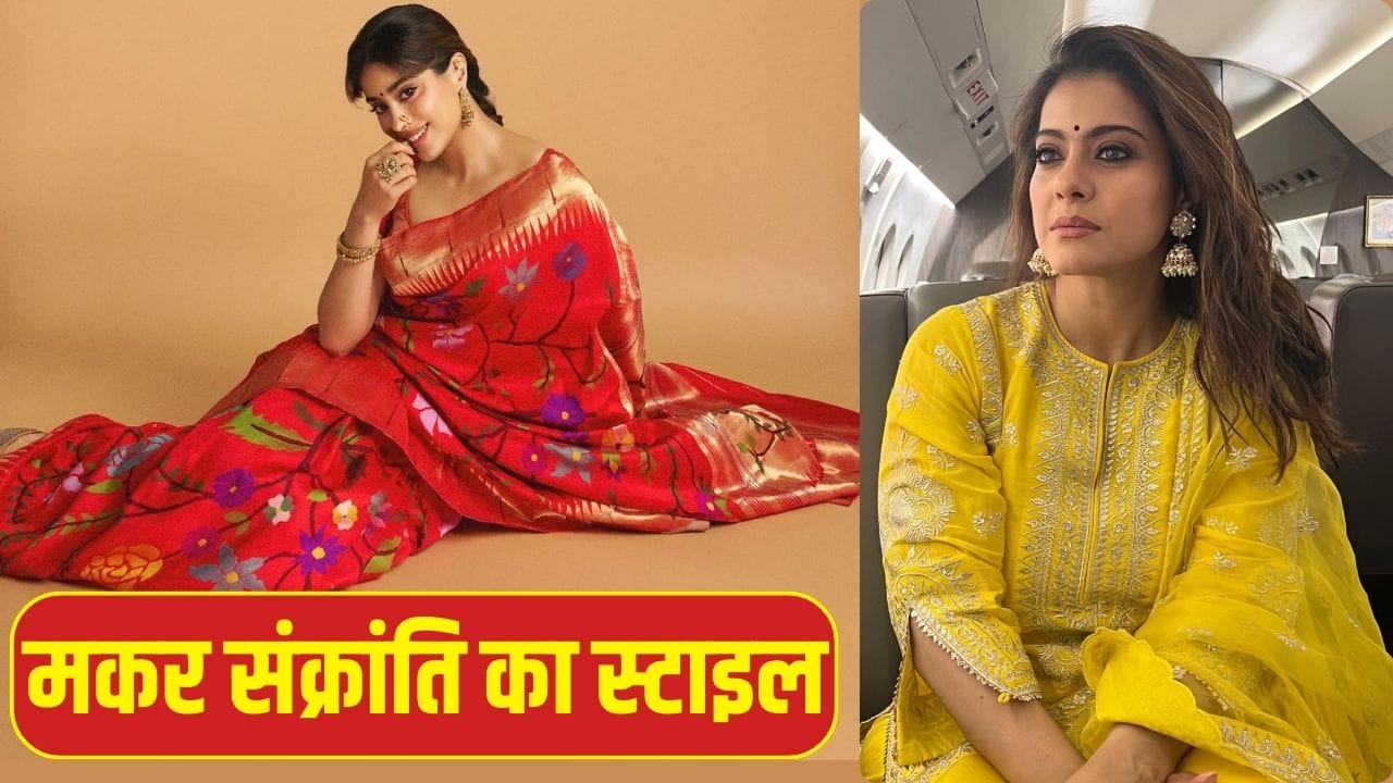 If you want to create a perfect ethnic look on the day of Makar Sankranti, then ideas can be taken from the color-design of suits and sarees given here. This look of Alia Bhatt is quite elegant and sophisticated. She is wearing a peach, orange, pink combination handloom saree which is tied in Nauvari style. Sleek hair style, neutral tone glam makeup and minimalistic accessories make her look even stronger yet.