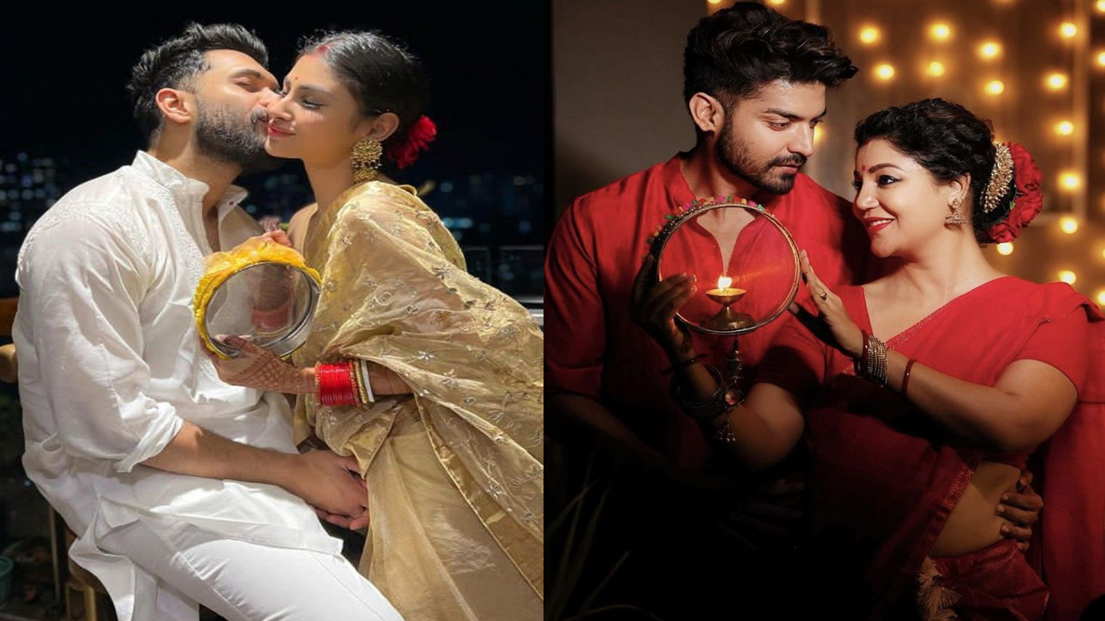 Here two couple poses are given, in one the actress is holding a sieve and her husband is kissing her on the cheeks. In the second pose, the actress is looking from the side holding a sieve with a lamp, while the actor is looking at her and has his hands on her waist. You too can give such romantic poses on this Karva Chauth.