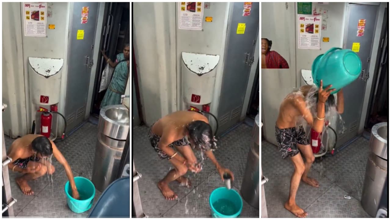A bizarre video showing a man bathing inside the coach of a moving train has sparked outrage and ridicule online. The now-viral clip showing him with a bucket and mug, casually scrubbing himself with soap and water, near the train’s toilet area, has reignited debate on how far people are willing to go for digital fame.