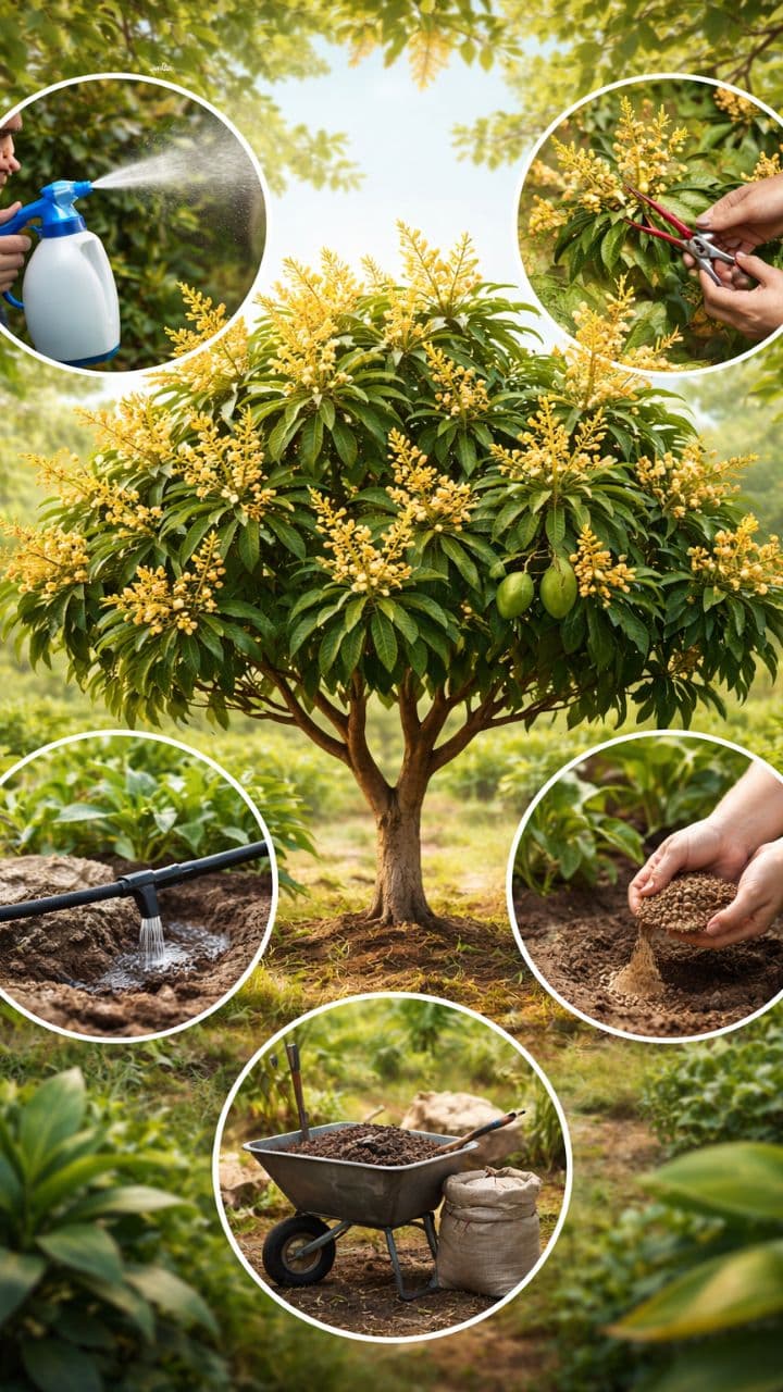 The need of nutrients like nitrogen, phosphorus and potash increases at the time of maturity of mango trees. Adding cowdung manure to the soil nourishes the trees and keeps them strong.