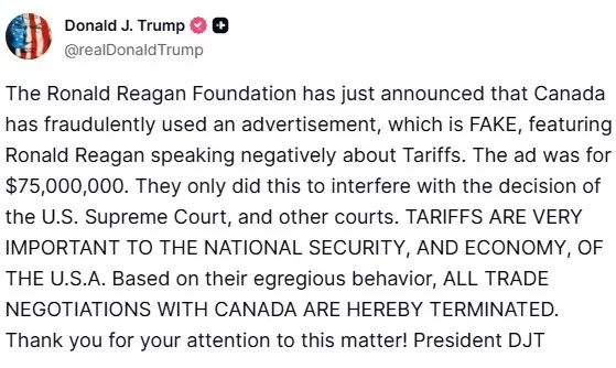 - A televised advertisement funded by the province of Ontario is the reason behind President Trump halting trade talks with Canada.