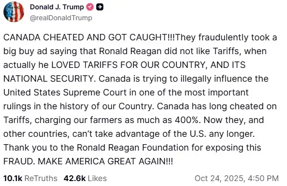“They fraudulently took a big buy ad saying that Ronald Reagan did not like Tariffs, when actually he LOVED TARIFFS FOR OUR COUNTRY, AND ITS NATIONAL SECURITY. Canada is trying to illegally influence the United States Supreme Court in one of the most important rulings in the history of our Country,” President Trump stated.