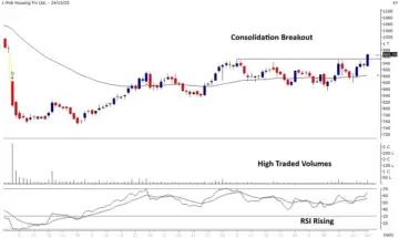 Stock has broken out from a consolidation zone with higher than average traded volumes on the daily scale. The MACD momentum indicator us rising to support the up move.
