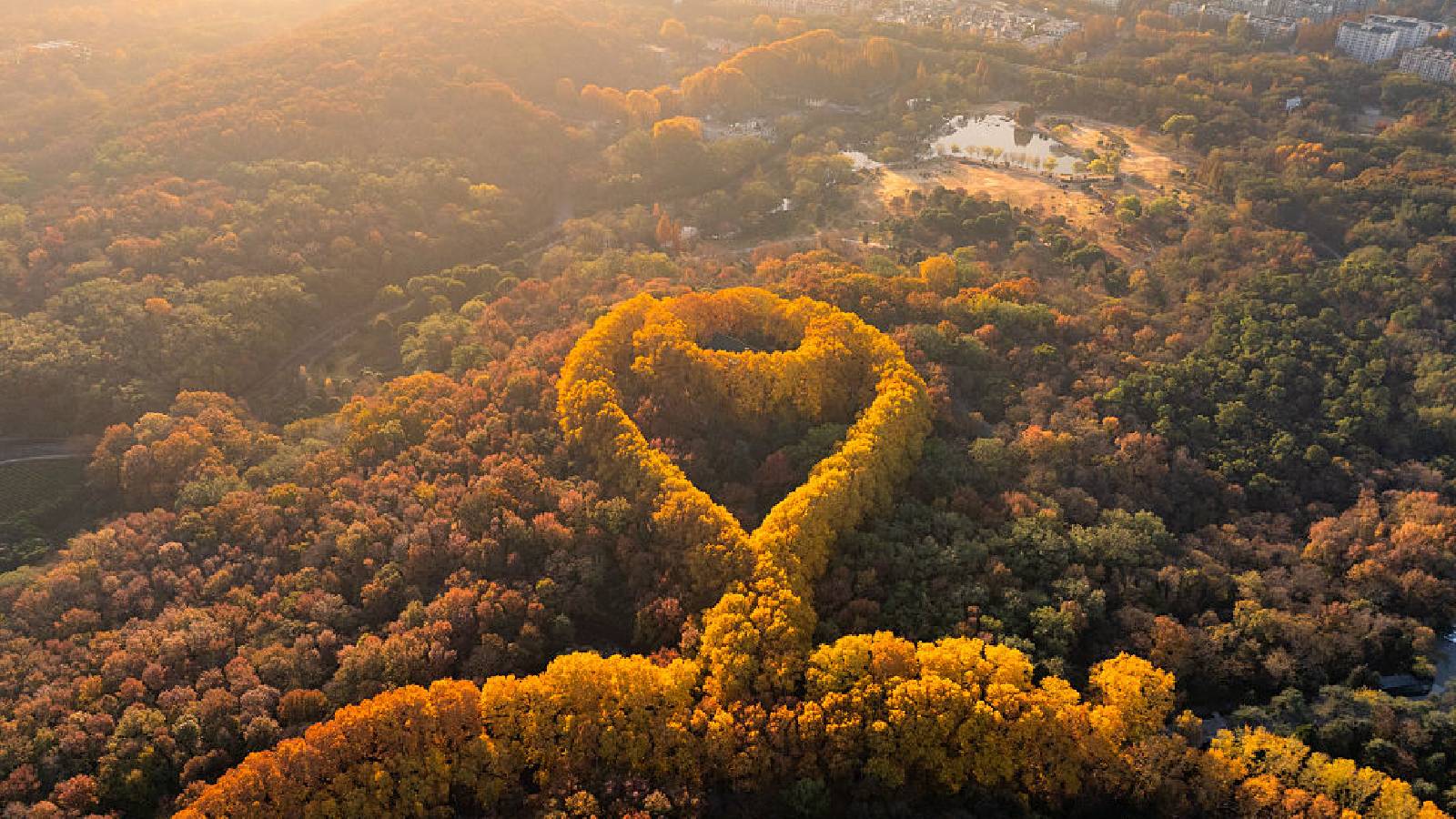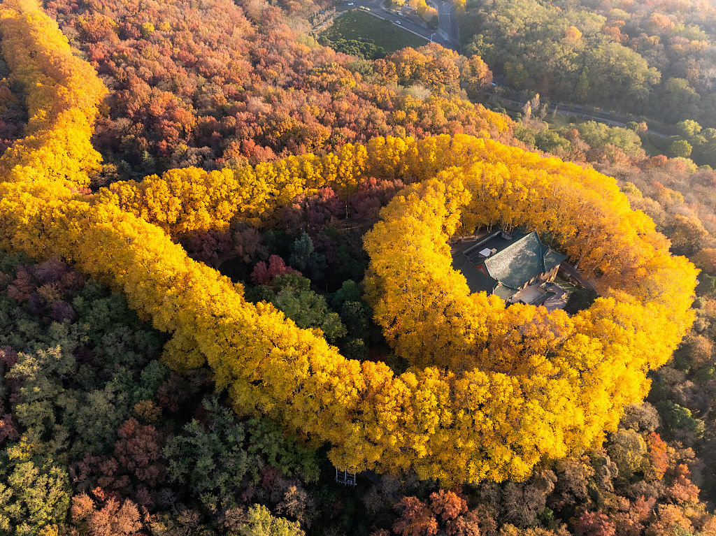 Meiling Palace Nanjing: This early winter aerial photo of Nanjing’s Meiling Palace shows the spectacular beauty of its golden leaves. This historic palace built by Chiang Kai-shek shines like a golden garland when the seasons change.
