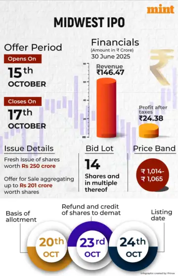 Midwest’s ₹451 crore IPO has a price band of ₹1,014-1,065 per share. The book-built offer is a combination of a fresh issue of shares worth ₹250 crore and an offer-for-sale (OFS) of ₹201 crore.
