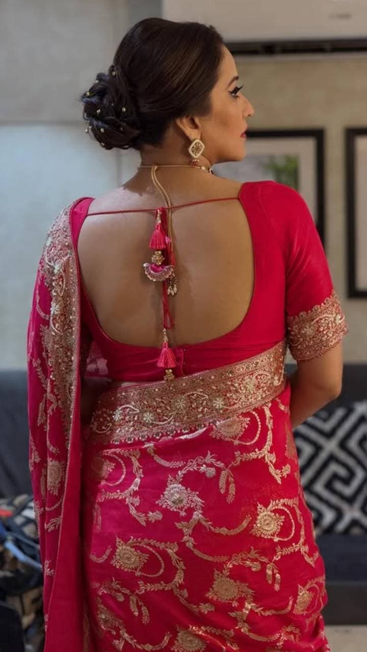 Bhojpuri actress Monalisa has looked very royal in red Banarasi saree and gold zari work. Deep back blouse, choker jewellery, low bun hairstyle and subtle make-up have added life to her traditional look.