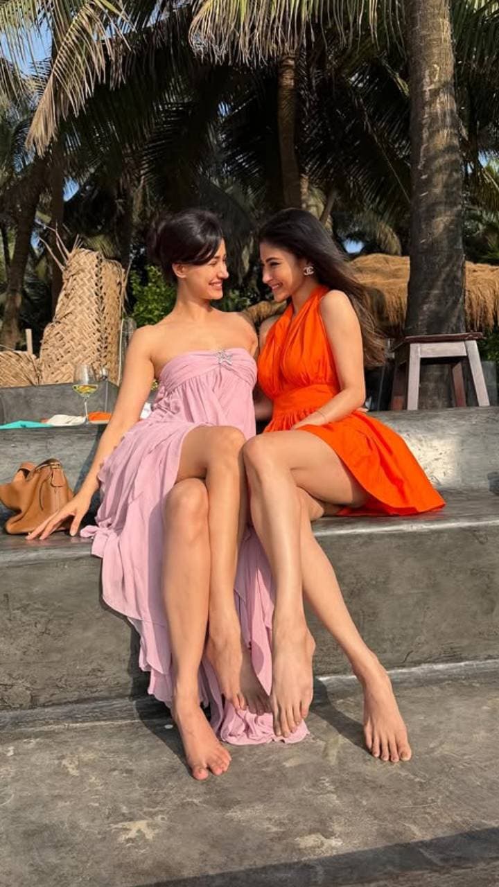 Mouni Roy and Disha Patani celebrated New Year party in Goa. She is giving BFF goals here. Mouni shared photos in white sheer top and orange while Disha shared photos in pink dress.