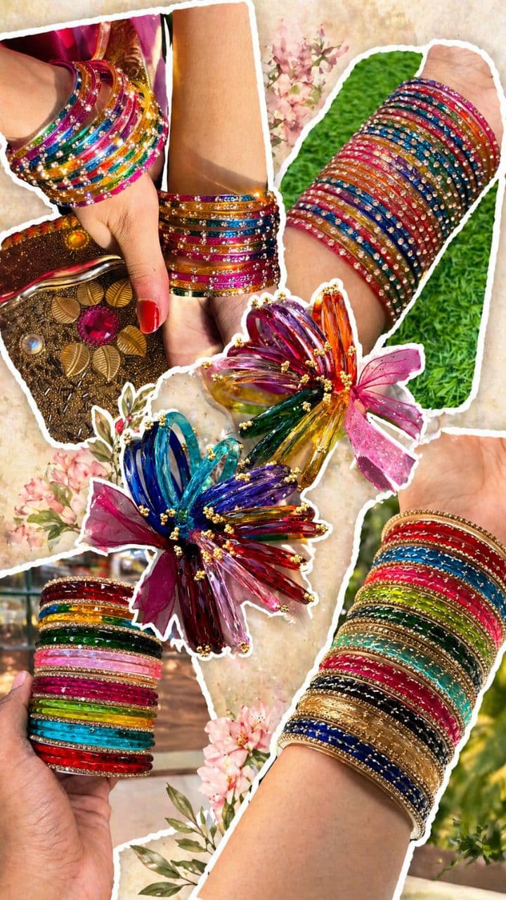 This beautiful design of multicolored cutting bangle is shiny and beautiful even without gems or pearls. These bangles will look great on hands in many colors including red, green, yellow and pink.