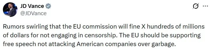 Hours before the EU announced its fine against X, Vice President JD Vance preemptively criticized it. “Rumors swirling that the EU commission will fine X hundreds of millions of dollars for not engaging in censorship. The EU should be supporting free speech not attacking American companies over garbage,” Vice President Vance said in a post on X.