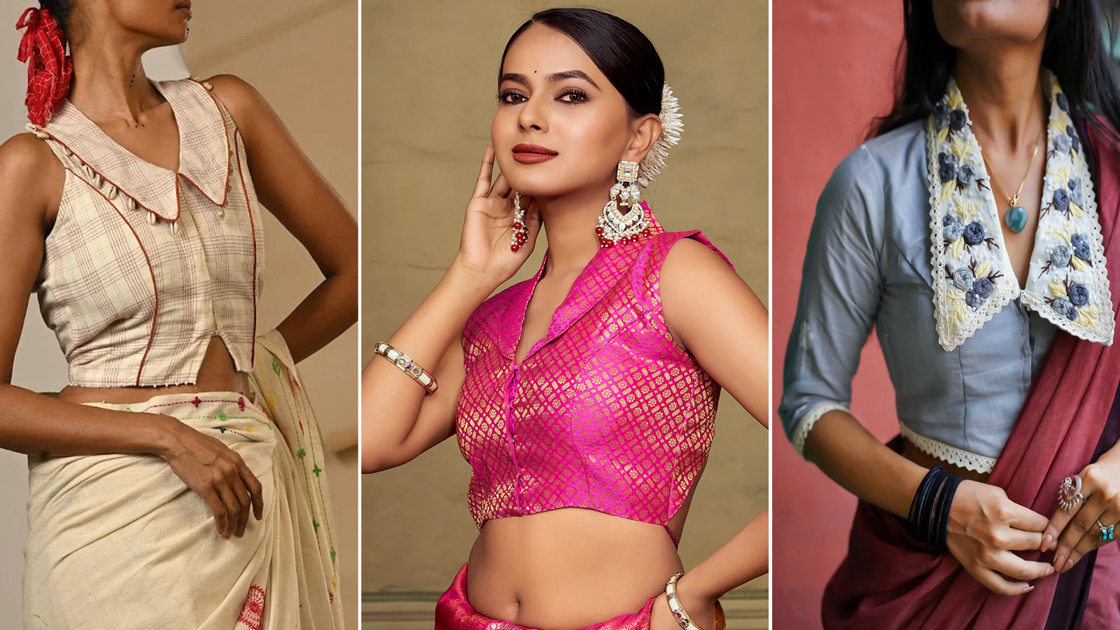 If you want a modern-traditional fusion, then choose a high neck design. Such blouse designs look elegant in pastel or mustard shades. These are perfect for the sister-in-law look. With clean cut in the front and without much embroidery, it will give a stylish look even with a plain saree.