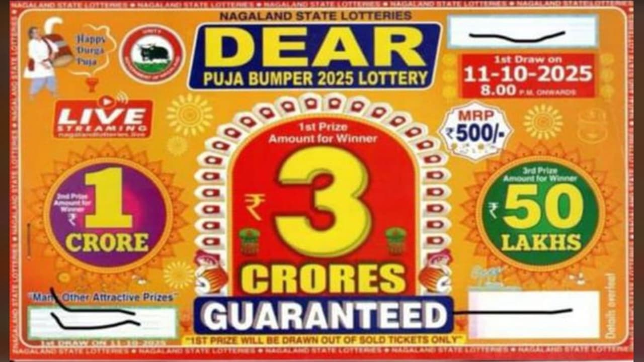 Nagaland State Dear Puja Bumper 2025 Lottery draw will be held on 11th October 2025 at 8 PM. The first prize is Rs 3 crore. The ticket price is Rs 500.