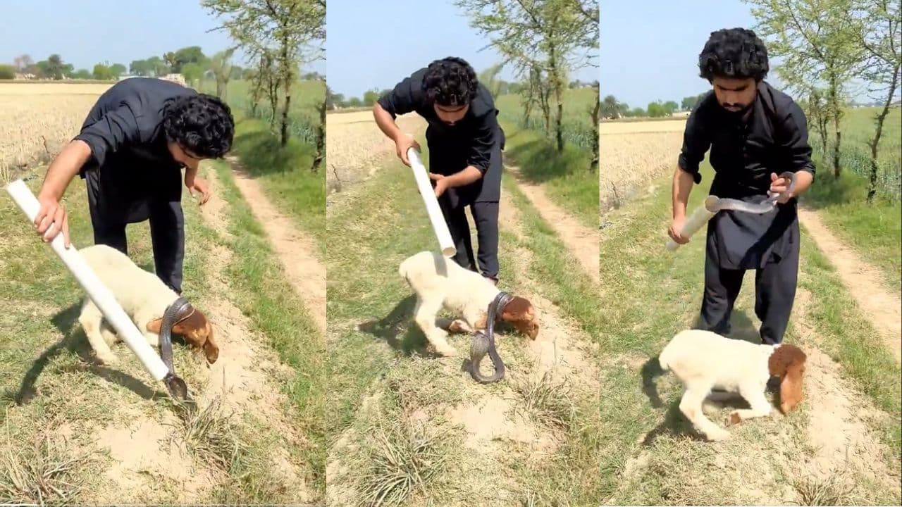 Shocking Viral Video: A shocking video is going viral on social media, in which a dangerous cobra is wrapped around the neck of a lamb, yet it is seen eating grass comfortably. Later its owner saves the lamb’s life by removing the snake with the help of a PVC pipe.