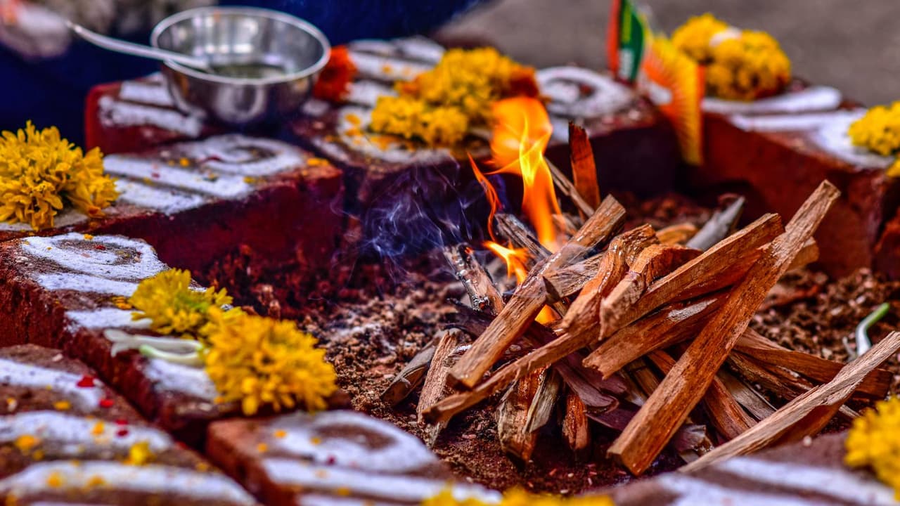 – Keep dry mango sticks in the Havan Kund and burn them with camphor. Now when the fire ignites properly, put the havan material in it.