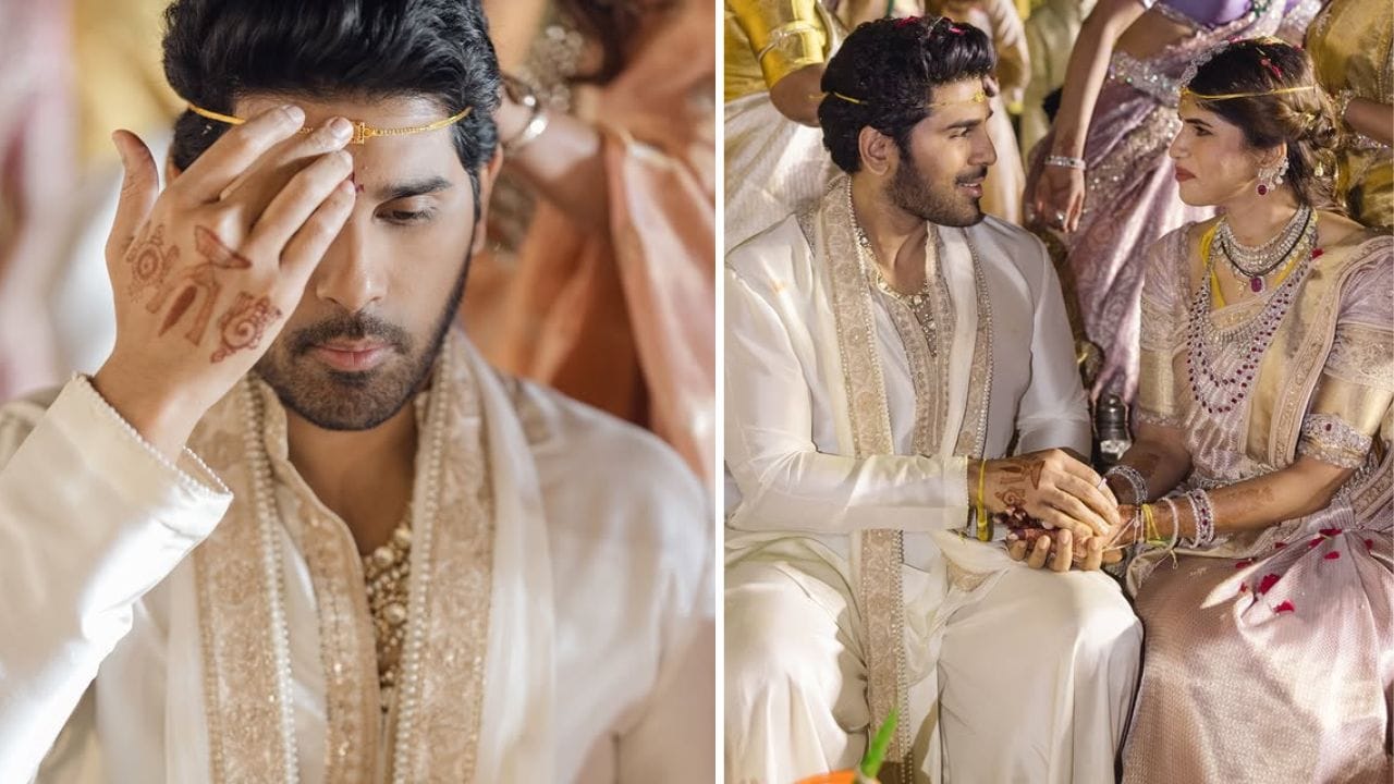 For the main ceremony, Allu Sirish wore an off-white silk sherwani detailed with fine gold embroidery along the placket and collar. A coordinated dupatta rested neatly over one shoulder, while a delicate gold headpiece with a central pendant added regal finish.