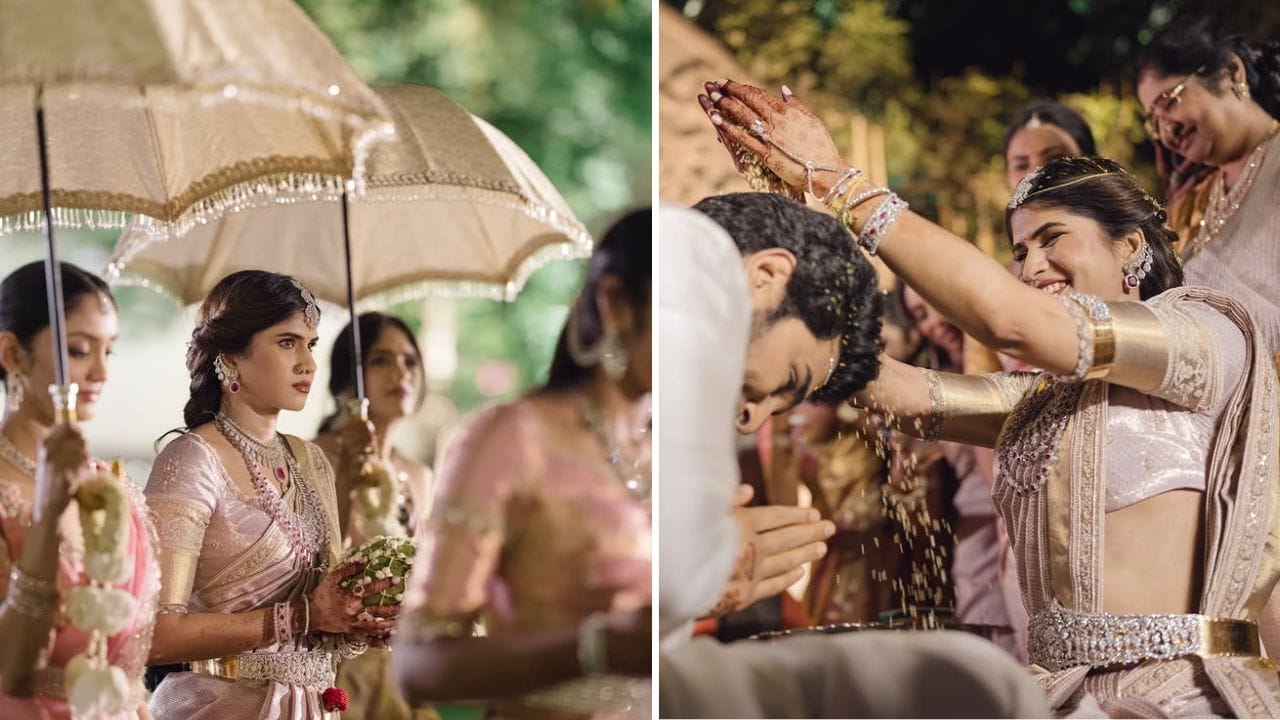 Nayanika’s saree palette moved between lavender and mauve tones with metallic detailing, while Sirish chose classic ivory and gold silhouettes rooted in tradition. Adding a personal touch, the groom’s mehendi featured sacred ‘shanku-chakram’ motifs associated with Lord Vishnu, replacing conventional floral patterns. Together, their looks reflected cultural pride without excess, proving that wedding style can feel both devotional and distinctly modern in equal measure. Let’s decode their wedding looks.