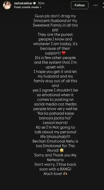 In a detailed note, Neha appealed to followers to keep Rohanpreet Singh and relatives away from the online debate. Neha wrote, “Guys plz don’t drag my Innocent Husband or my Sweetest Family in all this plz! They are the purest people I know and whatever I am today, it’s because of their support.” The clarification stressed support from close ones.