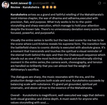 After the show was released , some fans reviewed it on X (formerly Twitter). On social media, the show received mixed reviews, as some viewers found it unique and interesting, while others saw it as a missed opportunity. One fan commented, “Kurukshetra is magnificent, well-executed war saga that delivers both visual grandeur and divine depth.” Another user penned, “Animation Very Disappointed Hai, yaar Netflix itna bada platform hai or animation quality is very bad.” A third user shared, “A stunning fusion of mythology and modern storytelling.”