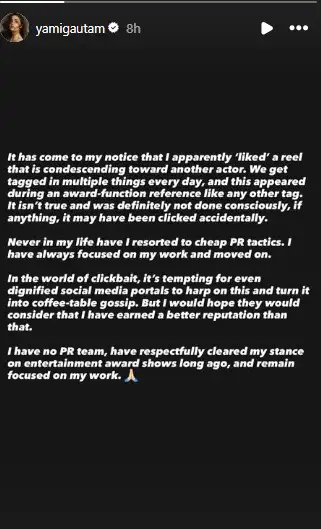 “It has come to my notice that I apparently ‘liked’ a reel that is condescending toward another actor. We get tagged in multiple things every day, and this appeared during an award function reference like any other tag. It isn’t true and was definitely not done consciously; if anything, it may have been clicked accidentally,” Yami posted on Instagram.