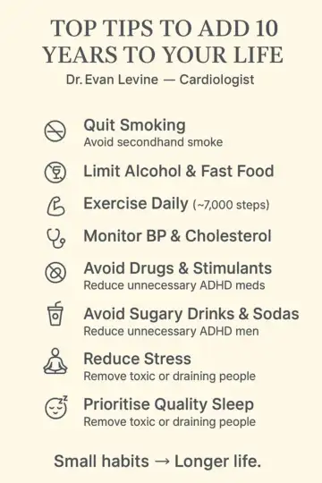 The cardiologist also highlighted the importance of stress reduction by avoiding toxic individuals and establishing consistent, healthy sleep habits, which lay a foundation for longevity.